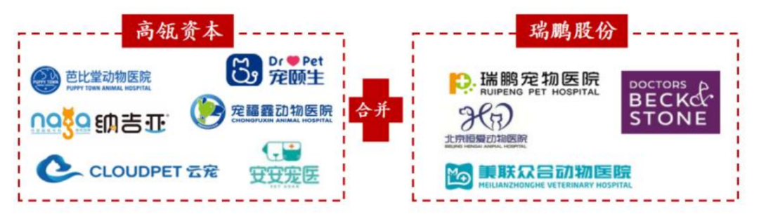 而后,瑞鹏和高瓴资本宣布达成战略合作,瑞鹏股份旗下450家宠物医院和高瓴资本投资的芭比堂、安安宠医、宠颐生等品牌旗下 700 家宠物医院合并,组建“新瑞鹏宠物医疗集团”,在整体规模数量上甩开了瑞派。