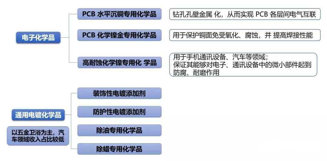 公司为新型表面工程专用化学品提供商,主要产品有电子化学品(电子工业)和通用电镀化学品(五金卫浴),广泛应用于 PCB、通讯基站设备、手机零部件、五金卫浴产品及汽车零部件等工业产品的表面处理。