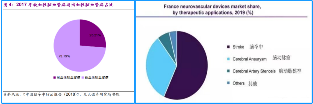 据《中国脑卒中防治报告(2018)》数据,2017年缺血性脑血管病患者占神经类新发患者的73.79%,而出血性脑血管病患者占神经类新发患者的26.21%。而以脑血管介入较为发达的法国2019年统计数据来看,脑卒中是市场占比最大的病种,其次是动脉瘤和脑动脉狭窄,预计我国未来可能也将呈现这一趋势。