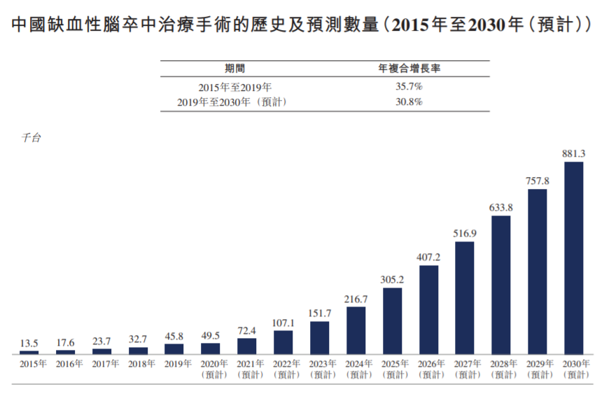 从手术量来看,国内缺血性脑卒中治疗手术量从2015年的1.35万台提升至2019年的4.58万台,年复合增速为35.71%。预计2030年将增至88.13万台,2019-2030年的年复合增速为30.8%,保持非常快速的增长。