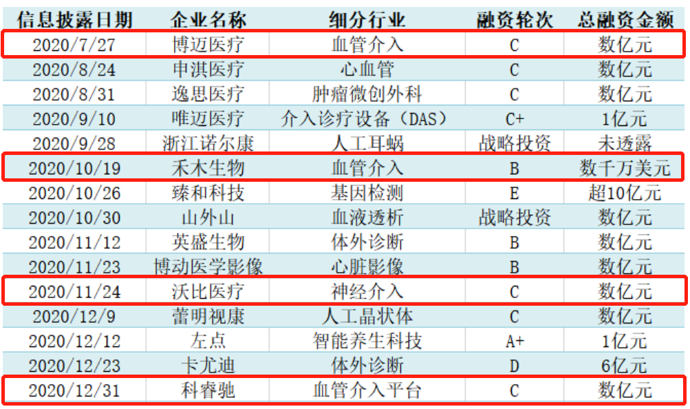 而在一级市场,2020年高瓴资本在医疗器械领域出手15次,其中有4次出手都与神经介入领域相关,包括拥有心血管介入&外周血管介入&神经介入多种产品组合的博迈医疗、拥有国内获批首个抽吸导管的禾木生物、唯一一个获得海外多地认证的神经栓塞介入产品的沃比医疗、拥有神经介入微导管的介入平台科睿驰。