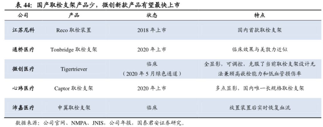 围绕上述的市场前景描述、卒中的治疗流程,我们可以划出值得关注的三个重点方向,一是介入器械使用频率较高且重要的取栓类产品,二是卒中适应症相关创新药,三是卒中患者预后的康复治疗器械及服务市场。