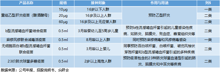 一类二类疫苗产品均有布局。公司的疫苗产品种类涵盖一类苗和二类苗,目前的主要产品有重组乙型肝炎疫苗(酿酒酵母)、b型流感嗜血杆菌结合疫苗、麻疹风疹联合减毒活疫苗、无细胞百白破b型流感嗜血杆菌联合疫苗(四联苗)、23价肺炎球菌多糖疫苗等产品。
