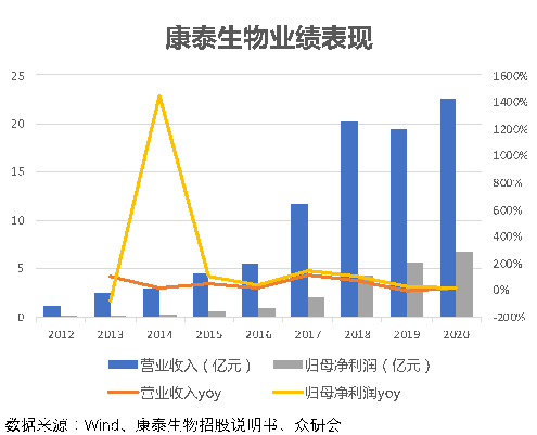 虽受行业黑天鹅影响,但整体业绩保持高速增长。康泰生物的营业收入从2012年的1.22亿元增长至2020年的22.61亿元,年化复合增长率达到44.04%;归母净利润从2012年的0.11亿元增长至2020年的6.79亿元,年化复合增长率达到67.42%。根据公司招股说明书披露的信息,2013年公司净利润大幅下跌主要是由于当年的“乙肝疫苗事件“,公司当时乙肝疫苗产线停产3个月,并计提存货跌价准备1743万元,虽然最终经过审查公司的疫苗质量无关,但是仍旧对公司当年的疫苗销售及利润表现造成了影响。2016年的”山东疫苗事件“又造成整个行业情绪的下降,但是康泰生物顶住压力实现逆势增长。2018年虽然有”长生事件“的影响,但是当年由于五联苗的长时间缺货导致公司四联苗销量大涨,最终使得公司当年业绩大幅上涨。好景不长,2019年”海南HPV“疫苗造假事件影响到了整个疫苗行业的销量,公司也受此原因在当年业绩表现中出现了小幅下降。2020年伊始,虽然公司的常规疫苗受到疫情的影响批签发量有所下降,但是康泰旗下的肺炎疫苗批签发量出现增长,导致公司2020年整体业绩实现提升。