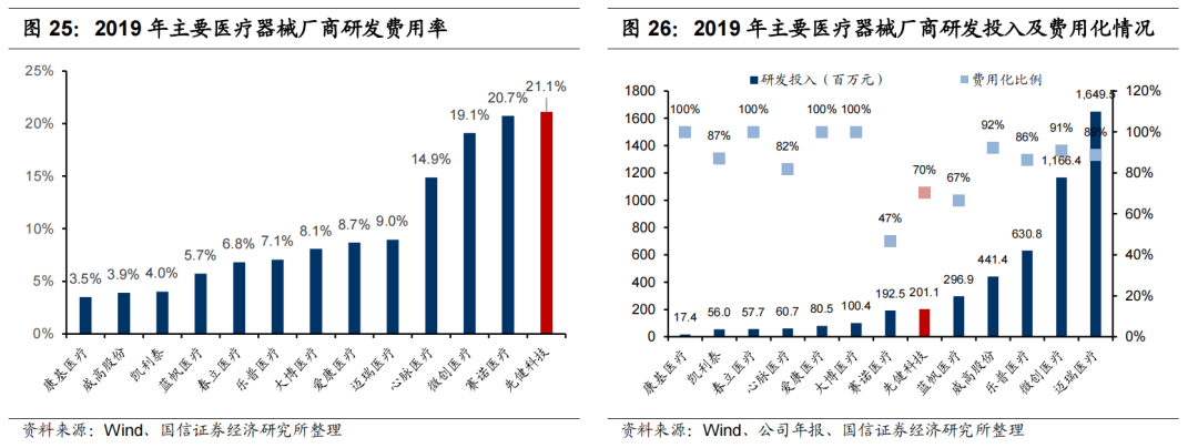 公司研发投入从2012年的0.36亿提升至2019年2.01亿元,研发费用率为30.1%(资本化后为21.1%),期间研发总费用达5.49亿,持续投入研发保证了公司的产品线不断丰富。在研产品主要集中于外周/主动脉和可吸收支架领域,预计自2021年起陆续上市。
