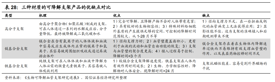 在当前可降解的三类冠脉支架中,先健在研的铁基合金支架是潜在的Best in class的产品,其拥有优于永久支架的力学性能、最小的支架杆厚度和最合理的支撑时间 。