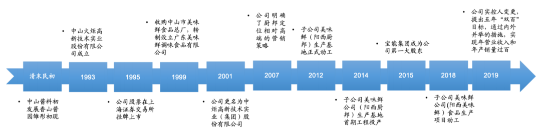 1999年,公司收购了中山市美味鲜食品总厂,并转制设立广东美味鲜调味食品有限公司,从此切入调味品行业。2001年公司更名为中炬高新技术实业(集团)股份有限公司。