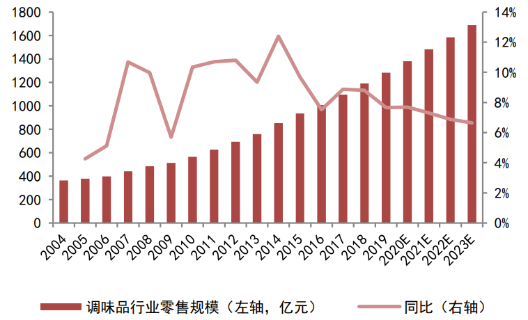 参考欧睿统计的调味品零售市场约8%-9%的年化增速,预测后续五年的调味品行业收入,2019 年或已达到4,000 亿元。