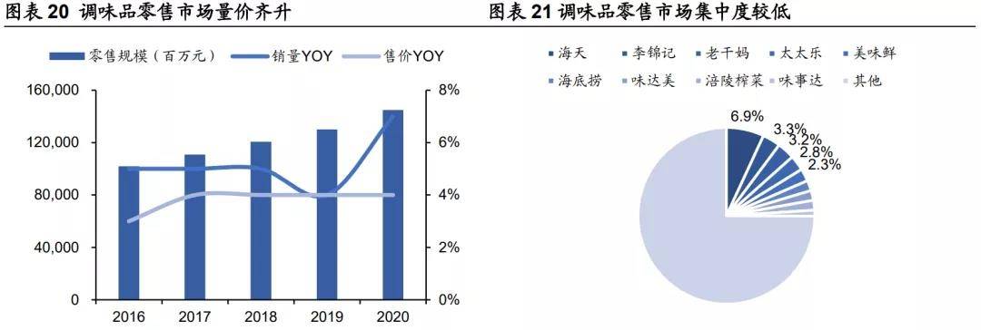 从竞争格局来看,调味品零售市场量价齐升,市场集中度有待提升,仍未出现绝对龙头。调味品零售规模保持较快增长,从 2016 年的1,019 亿元增至2020 年的1,450 亿元,CAGR达到 9.2%。