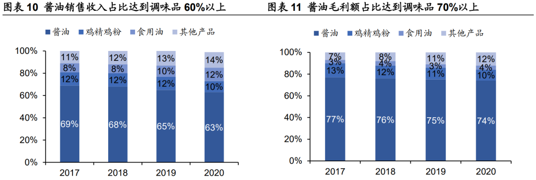 酱油仍是公司调味品主要业务,食用油和酱醋料酒等其他产品占比持续提升。酱油销售收入和毛利率在调味品业务中占比分别达到60%和70%以上,但近年来公司加大食用油和其他调味品投入力度,酱油占比有所下降。