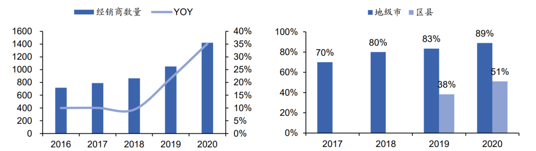 公司采取经销商为主,直营为辅的营销模式。通过发展高质量的经销商队伍,力求产品最大化覆盖市场终端,截至2020 年末,公司经销商数量已超过1,400 家,在全国地级市开发率达89%,区县市场累计开发率 51%,销售网络全国化加速推进。