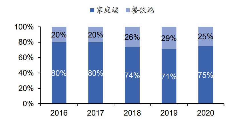 2020年疫情冲击餐饮消费,家庭消费增量不足以弥补餐饮下滑,因此增速出现短暂放缓。预期疫情后增速仍将维持在5%-10% 区间。