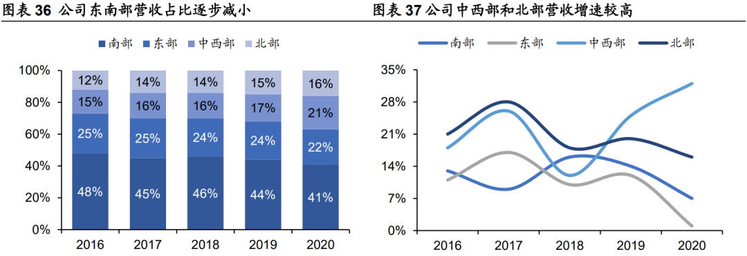 公司中西部和北部营收占比常年在30%以下,近年来销售发力迹象明显,占比预计持续增加。2020 年,中西部营收占比已超过20%,北部占比亦提升至16%,东南部优势区域比例则减至 70%以内。增速方面,近两年中西部增速超过25%,北 部也在20%左右,明显高于东部、南部等成熟市场。