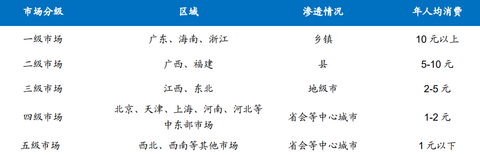 公司在北部、中部区域的市场潜力有待开发。公司根据人均消费金额把全国市场分成五级:一级市场成熟度最高,包括广东、海南、浙江,人均消费在10 元以上,销售网络已下沉至乡镇。二级市场包括广西、福建,人均消费超过5 元,销售网络覆盖县城层级。