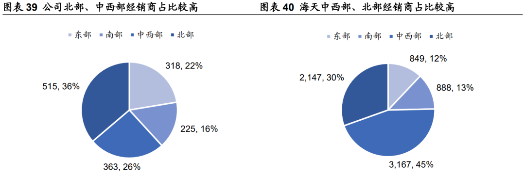 如观察区域占比,公司中西部和北部经销商占比小计达到62%,海天则更高,达到 75%,判断上述区域均是双方下一步重点耕耘的市场。