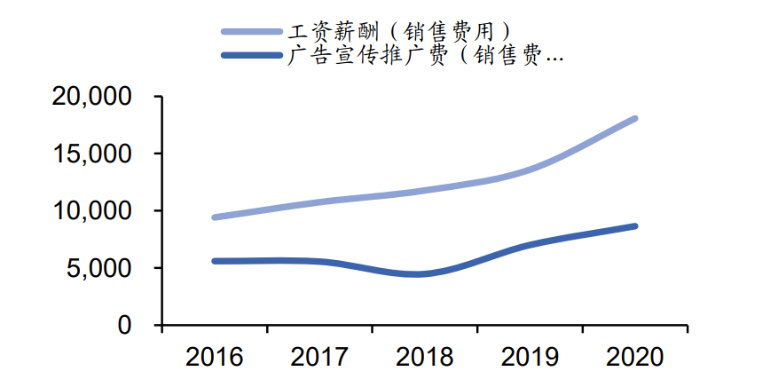 销售队伍同步扩充,广告投入力度加强。为匹配销售区域拓展和经销商数量增加,公司销售队伍从 2018 年开始大幅度提升,从989 人增至2020 年的1,620 人,广告宣传费用也从 2018 年的4,473 万元增至2020 年的8,657 万人元。销售人员和市场投入的增加有助于公司完善经销商服务与管理体系,放大品牌声量,促进终端销售。