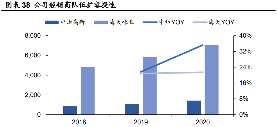 公司经销商数量高速增长,北部和中西部占比高,销售网络逐步完善。公司与海天的经销业务均占绝对比例,主要通过经销商完成网点开拓、终端维护、市场信息反馈,经销商招募与合作是构筑营销网络的前提,特别对于培育期的局域市场,通常需要多家较小的经销商实现多渠道铺货,而成熟市场经营多年,大经销商多渠道操作能力和下沉市场运营能力均较强,市场向这些实力较强的经销商集中,数量反而会减少。公司 2020 年经销商超过1,400 家,虽然与海天的7,051 家相比较低,但同比增速达到35%。