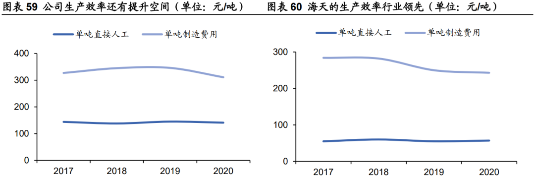 另一方面,生产效率也是不可忽视的问题。公司生产效率行业领先,但与海天相比还有提升空间。2020年,公司单位制造费用和人工成本分别为 311 元/吨、141元/吨,海天则为243 元/吨、57/吨,二者合计差值达到160 元/吨,占公司生产成本的5%左右。