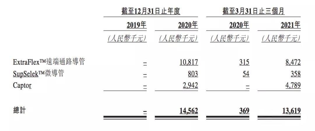 就最新的招股资料显示,2021年第一季度心玮的收入已经出现暴涨态势,收入1361.9万元人民币,同比增长3590%,已接近去年全年收入,主要得益于自于2020年3月开始商业化销售的ExtraFlex™远端通路导管。而另外两款后续商业化的产品SupSelek™微导管和Captor™也取得了不错的营收。