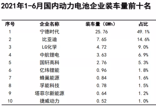 2019年-2021年上半年,宁德时代占国内动力电池市场占有率分别为51%、50%、49%。