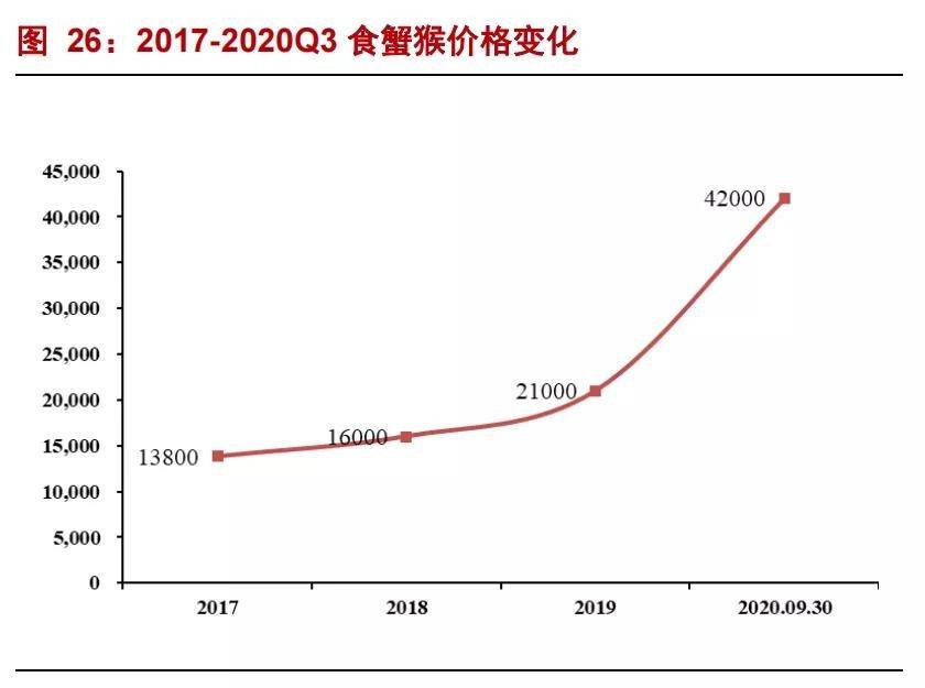 据昭衍新药的招股说明书显示,2014年时一只食蟹猴的价格平均为6567元;截至2020年三季度,价格飙涨至42000元,6年涨了接近7倍。