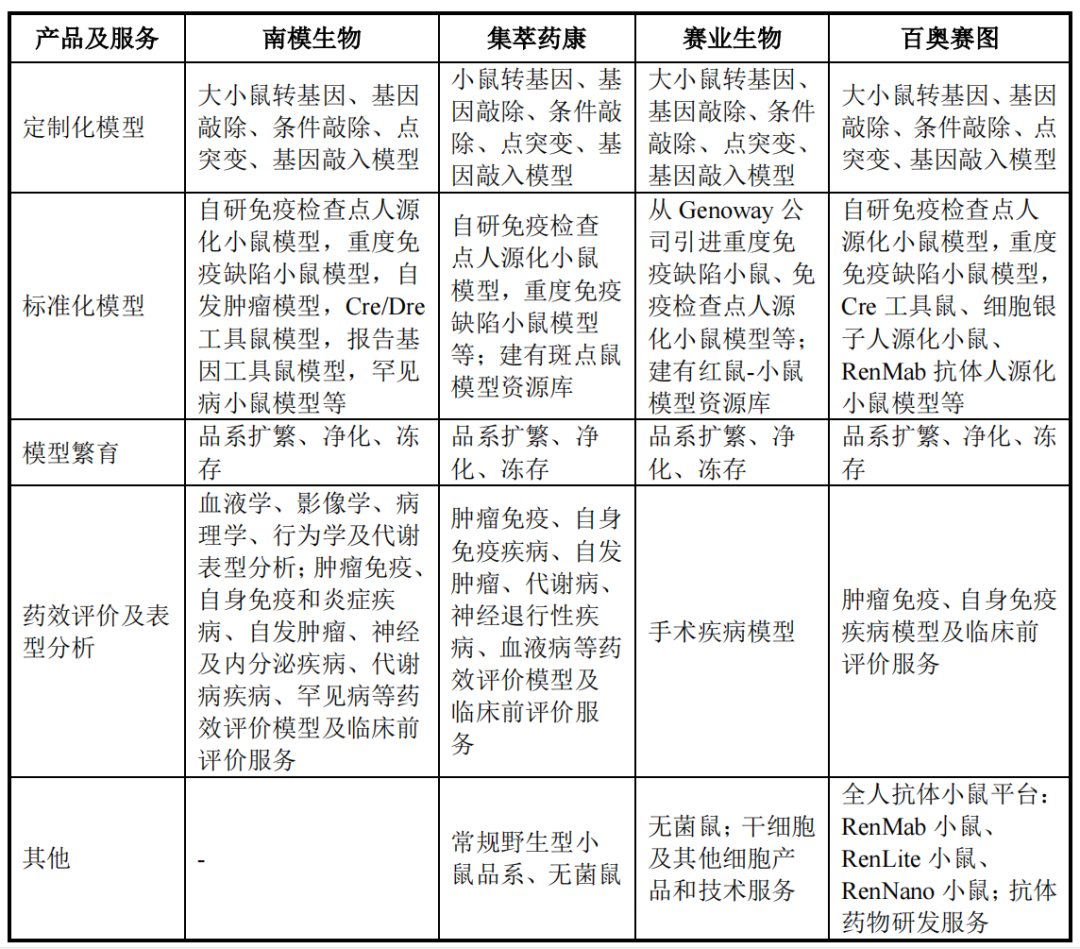 - 集萃药康:公司成立于2017年,基于实验动物创制策略与基因工程遗传修饰技术,为客户提供具有自主知识产权的商品化小鼠模型,同时开展模型定制、定制繁育、功能药效分析等一站式服务,满足客户在基因功能认知、疾病机理解析、药物靶点发现、药效筛选验证等基础研究和新药开发领域的实验动物小鼠模型相关需求。