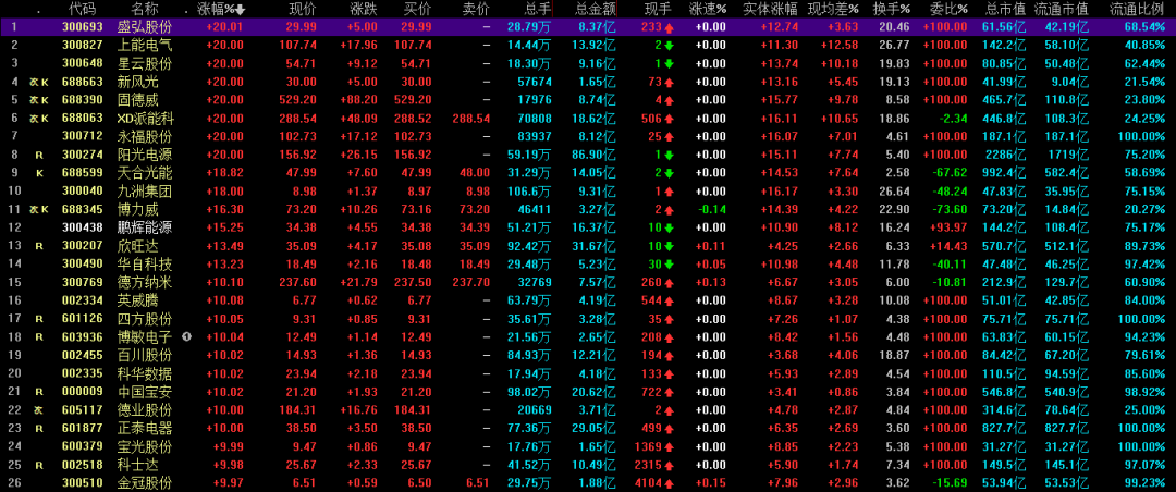 受利好消息刺激,A股储能板块持续保持强势,今日大涨7.12%,超过20只概念股涨超10%,其中上能电气、阳光电源等8只个股20%涨停!