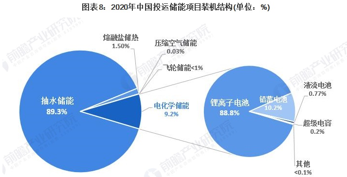数据显示,截至2020年底,我国已投运储能项目累计装机规模为35.6GW,其中抽水蓄能为31.79GW,占比89.3%,电化学储能为3.27GW,占比9.2%,排名第二。