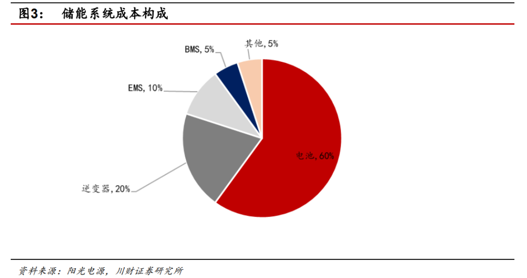 在储能系统的成本构成中,电池是储能系统最重要的组成部分,成本占比60%;其次是储能逆变器,占比20%,EMS成本占比10%,BMS成本占比5%,其他为5%。