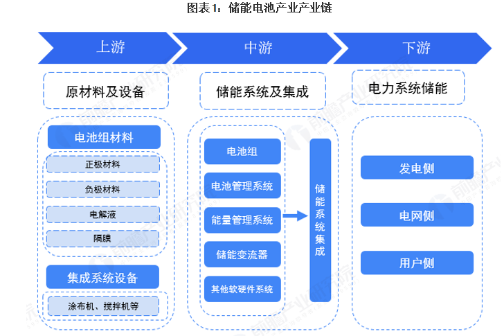 在储能电池产业链中,上游为原材料及设备,中游为储能系统及集成,下游为电力系统储能应用。