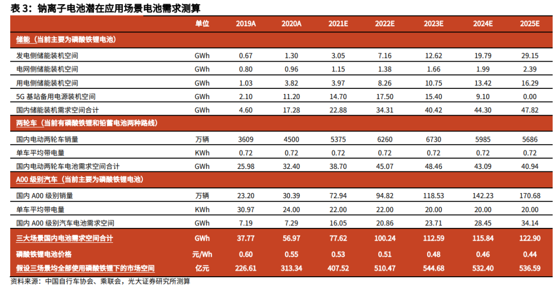 有机构预测,到2025年,钠离子电池在A00级别汽车、两轮车、储能三大领域需求量将达到123GWh,对应市场空间为537亿元。