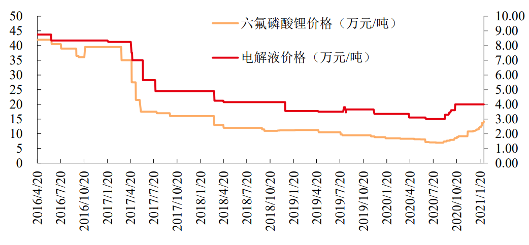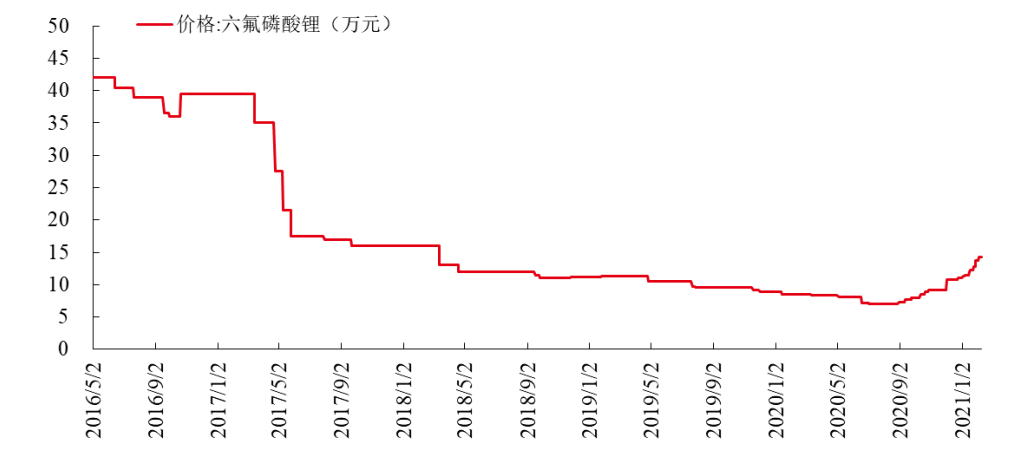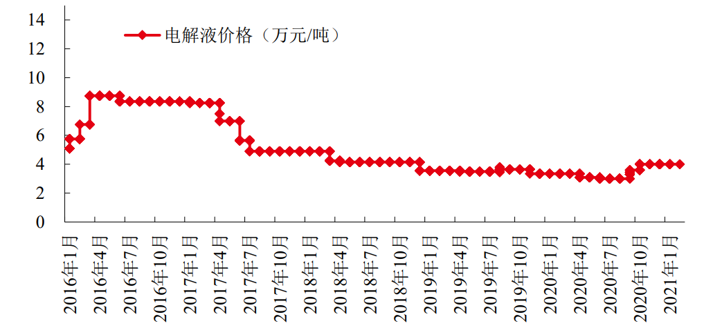 在2016年新能源车销量快速增长的过程中,电解液价格曾经出现过较为明显的上行过程。2017年以后,伴随市场供给的逐渐充裕,电解液价格经历了一轮暴跌,随后三年便持续维持在低位。