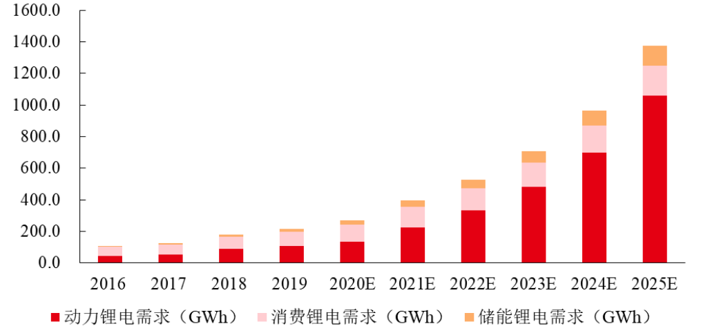 作为锂电池的核心材料之一,电解液的需求量主要取决于锂电池的生产需求。按照下游需求的不同,锂电池可以划分为消费锂电、动力锂电和储能锂电。由于新能源车的高景气度,动力锂电成为了目前锂电池市场最重要的增量来源。