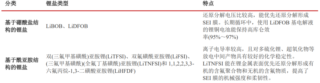 除了添加剂的研发之外,近年来一些新型锂盐也开始越来越多得到应用。LiPF6被广泛应用在锂离子电池中。新型锂盐由于成本和产能限制等的原因,目前还无法完全取代传统的六氟磷酸锂,仅作为辅助产品在电解液内小比例的添加,后续随着技术的逐渐成熟和成本的逐渐降低在实践中有望得到越来越广泛的应用。