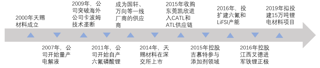 天赐材料于2000年在广州成立,2014年在中小板上市。公司成立早期主营业务为个人护理产品材料生产和销售,在2005年开始公司切入电解液生产领域,并在2011开始实现资产六氟磷酸锂。2015年公司收购东莞凯欣,成功打入ATL和CATL供应链,目前电解液市场份额位居市场第一。