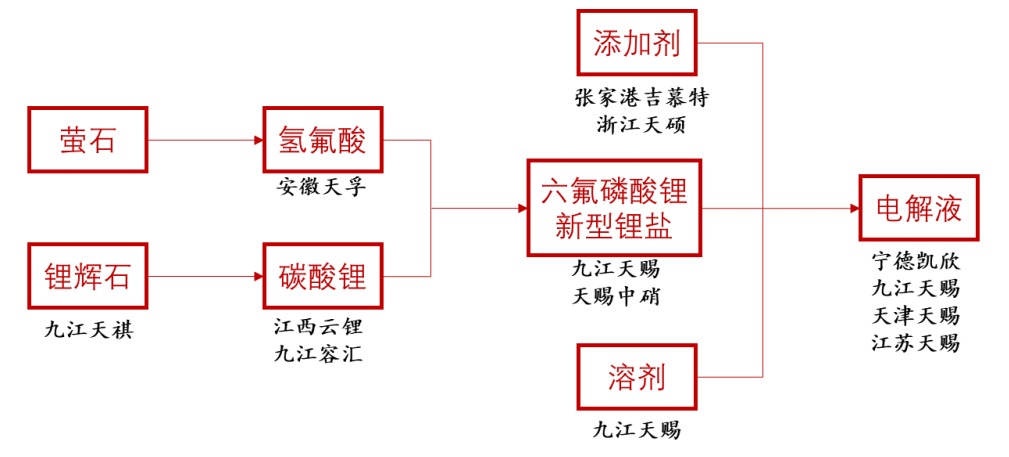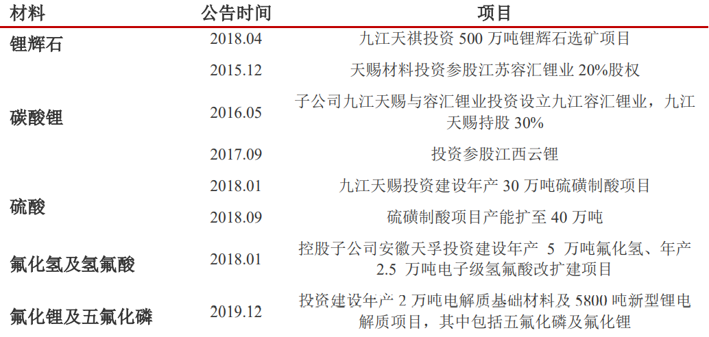 在传统的电解液业务基础上,公司通过九江天赐、吉慕特和浙江天硕等布局锂盐和添加剂,并通过九江天祺等布局上游的锂辉石、氢氟酸和碳酸锂,实现了纵向一体化布局,横向上公司进军正极业务,控股江西艾德掌握磷酸铁锂正极产能。