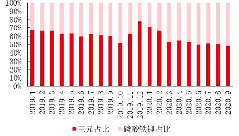 目前国内动力锂电正极主要以磷酸铁锂和三元两种技术路线为主。2017年开始由于补贴规则鼓励提升新能源车能力密度,三元电池装机占比开始逐渐提升。2020年后,随着补贴逐渐降低影响弱化,新能源车锂电池装机出现分化,在低端追求性价比的车型上,磷酸铁锂电池装机开始逐渐提升。
