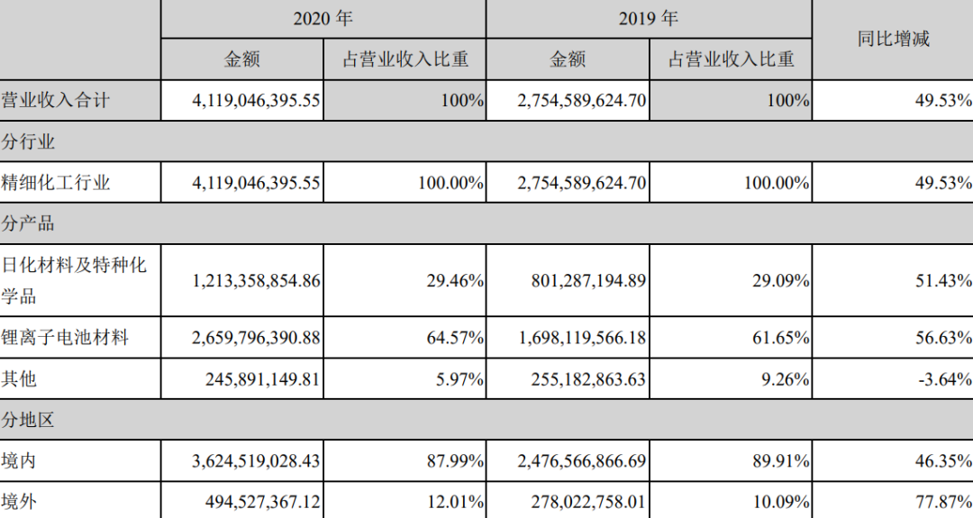 2020年,公司实现营收41.19亿元,同比增长50%,归母净利润5.28亿元,同比增长44倍。营收和利润的大幅增长主要来自疫情对日化产品的拉动和8月六氟磷酸锂价格触底回升,盈利能力增强。下游客户以宁德时代为主,前五大客户占比达到了43.47%。