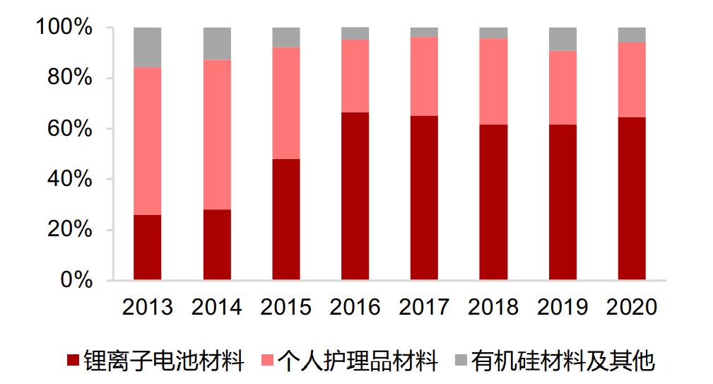 目前公司主要业务为锂离子电池业务,其中主要是电解液业务,还有少量正极业务;个人护理品材料产品占比大概在30%左右,其余业务占比10%左右。