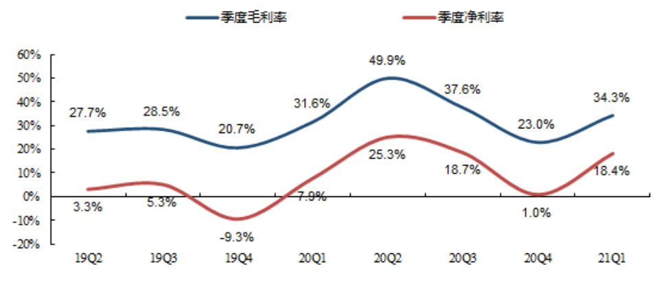 公司21Q1毛利率为34.33%,环比增长11.29个百分点,同比增长2.74个百分点;21Q1净利率为18.70%,环比增长18.43个百分点,同比增长11.17个百分点。