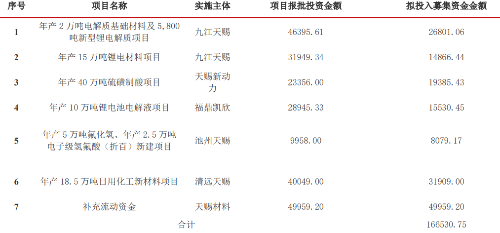 本次募投项目中,2万吨电解质基础材料及5,800吨新型锂电解质项目主要包括1.6万吨/年五氟化磷、4000吨/年氟化锂、4000吨/年LiFSI、1800吨/年电解液添加剂,年产15万吨锂电材料项目主要包括6万吨/年液体六氟磷酸锂、7万吨/年溶剂、15万吨/年电解液母液。