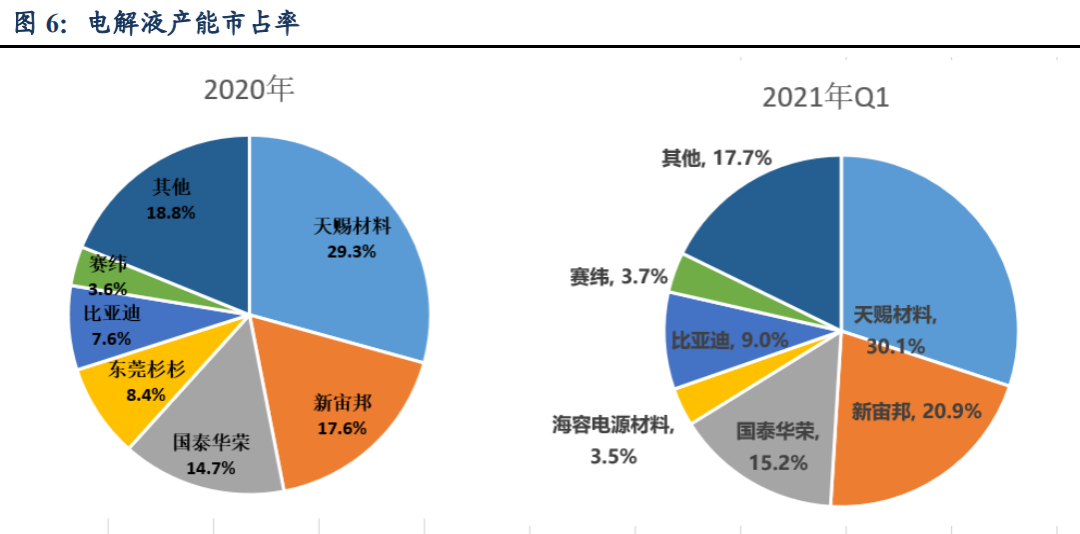 天赐材料起家于精细化工日化领域,深耕电解液市场十年,出货量稳居第一,2020年市占率27%。