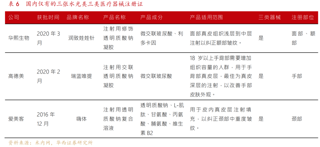 在此背景下,去年3月,润致旗下水光产品——润致娃娃针获批上市,目前,国内仅有三张水光针三类医疗器械注册证,其一,便是大家十分熟悉的爱美客嗨体(爱美客近5年的高增长都要归功于这款大单品)。