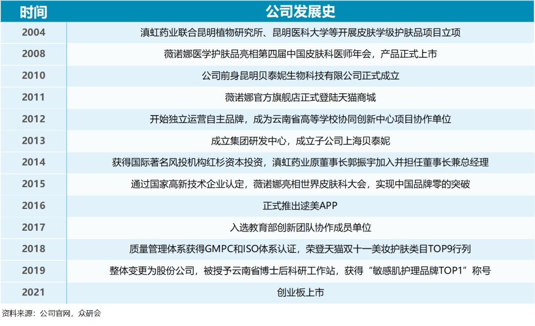 贝泰妮前身为成立于2010年的昆明贝泰妮生物科技有限公司,但公司的核心品牌的诞生时间比公司成立的时间更早。薇诺娜是滇虹药业2008年孵化的多个项目之一。不过由于早期经营状况不佳,不仅营收贡献比例极低,且持续亏损。所以滇虹药业在筹划上市时便把这些品牌进行了清理,贝泰妮便是在这个时候接手了薇诺娜包括商标、专利、域名、技术和配方的相关资产业务。