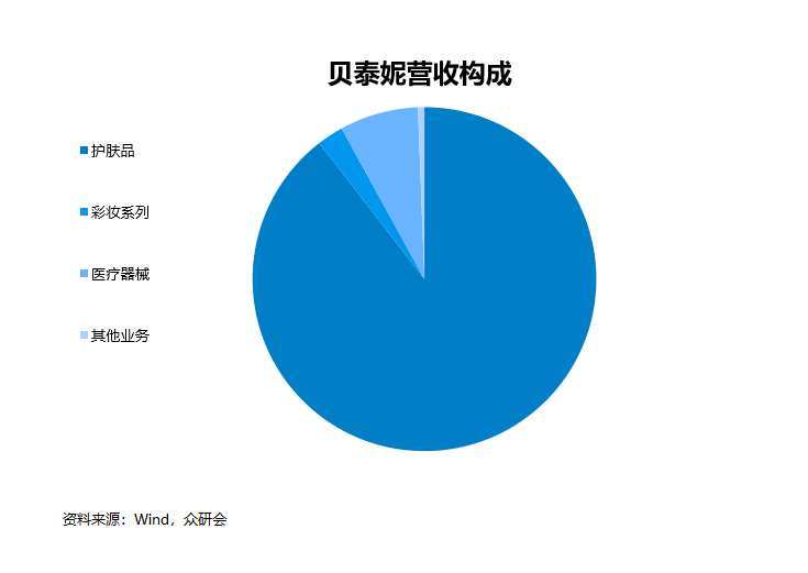 公司专注于针对敏感性肌肤,应用纯天然的植物活性成分提供吻合、专业的皮肤护理产品。贝泰妮营收构成主要来自于护肤品、彩妆和医疗器械三大类,占比分别为89.52%、3.28%和7.40%。其中医疗器械主要是指透明质酸修护生物膜、透明质酸修护贴敷料等。