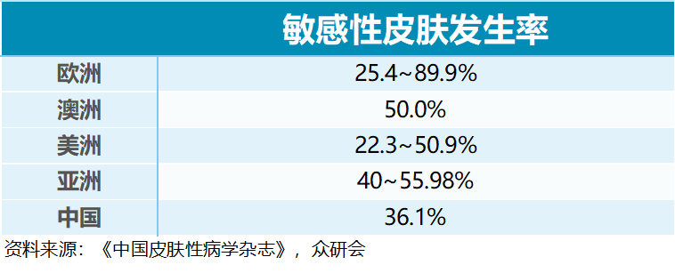 敏感肌与成分党是皮肤学级护肤品发展的底层逻辑。根据《中国皮肤性病学杂志》2017年1月所刊发的《中国敏感性皮肤诊治专家共识》,敏感性肌肤在世界各国发生率普遍较高,其中我国女性敏感肌肤发生率约为36.1%,与世界其他国家相比仍处于较低位置。