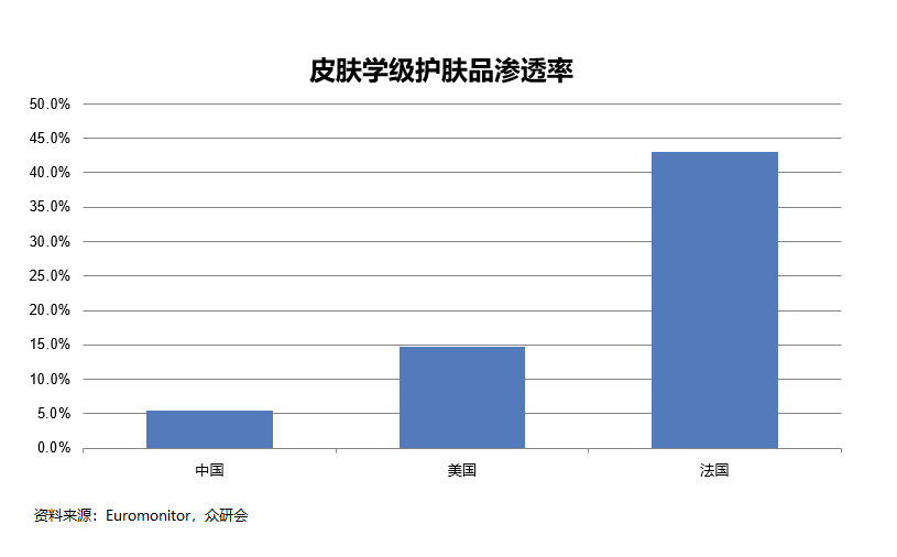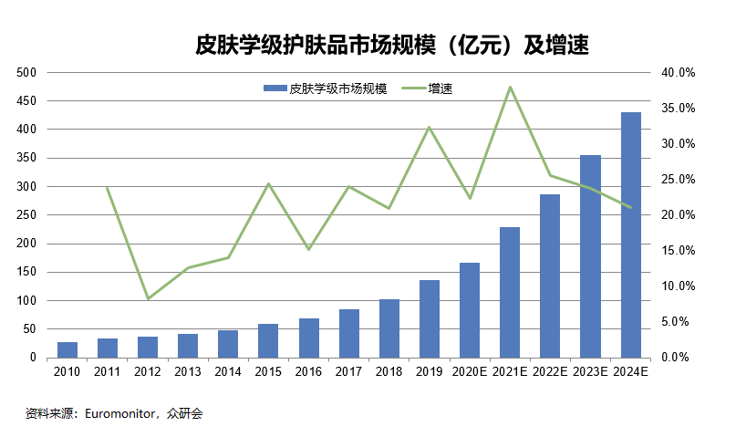 另一方面,没有被裹挟的人群又会被几年来逐渐严重的空气、环境污染、紫外线加强、压力、不良饮食习惯等问题影响,肌肤敏感的发生率持续提升。Euromonitor数据显示,2015-2020年我国皮肤学级护肤品市场规模从60亿元增长至166亿元,期间复合增速为24%,并预计将以每年不低于20%的增速于2024年增长至约431亿元。