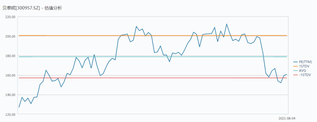 公司由于上市时间尚短,股价和估值的波动的参考性均较弱。从变动情况来看,贝泰妮的股价自上市以来与爱美客等医美概念股走势极为相似。严格来讲,贝泰妮的产品中仅透明质酸修护生物膜、透明质酸修护贴敷料为医美相关产品,且在主营业务中的占比较少,仅为7.4%。大部分的营收依然是来自于护肤品类,若以医美行业的估值来对标显然是不合适的。