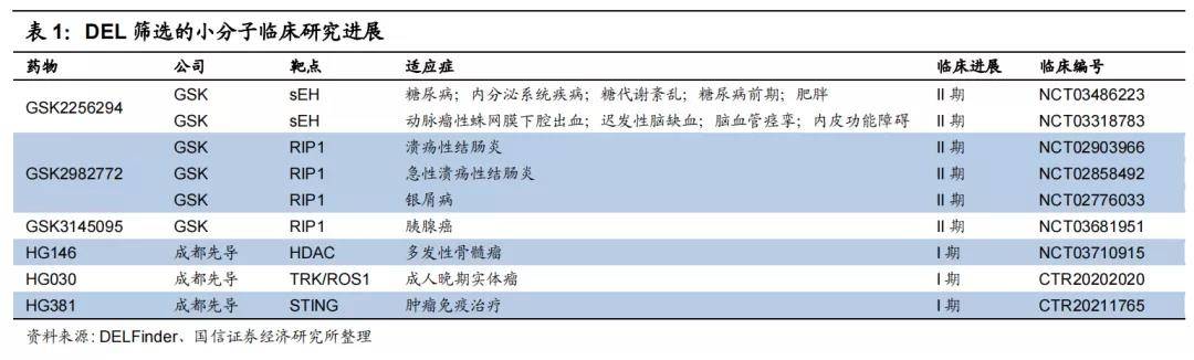 目前,全球并未有利用DEL技术筛选小分子药物成功上市,进度最快的管线为GSK的sEH和RIP1抑制剂在临床二期,紧随其后的是成都先导,未来将有越来越多的候选药进入临床。