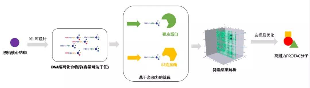 DEL技术可以充分发挥其高通量筛选的优势,其DNA编码化合物库可以拥有上百亿、千亿容量的化合物,针对同一个E3连接酶或靶点蛋白,平台可以进行多次平行筛选,解决同一E3连接酶可能存在的不同构象的问题,庞大的分子库保障了小分子结构的多样性和新颖性。同时,DEL技术亲和性筛选的模式也保证了靶蛋白和配体间存在较好的结合力。